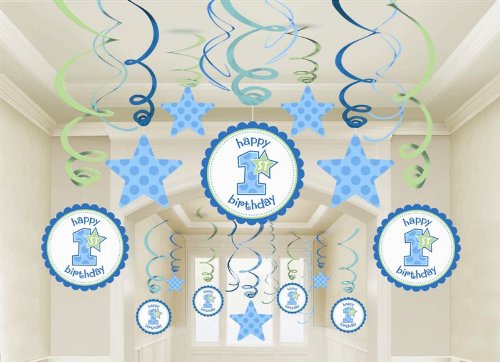 - Mega Value Pack of First Birthday Boy Hanging Swirl Decorations.